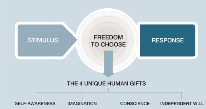 Theo bài viết trên trang Franklin Convey, giữa Stimulus (tác nhân) và Response (phản ứng), con người luôn có một khoảng không gian — Freedom to Choose — được xây dựng từ 4 năng lực đặc biệt:
