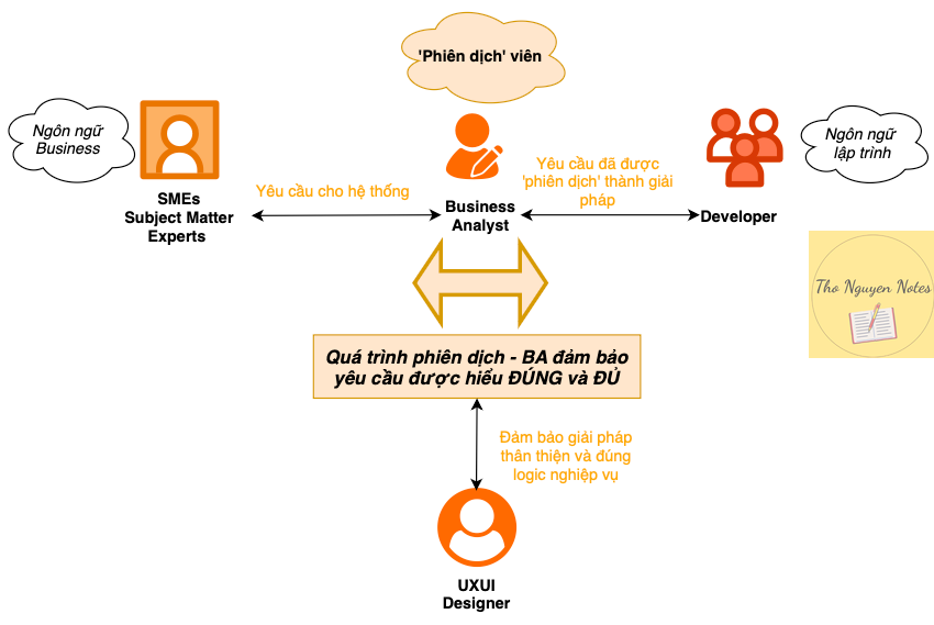 Lúc này BA xuất hiện chính là cầu nối gắn kết các bên liên quan, là người phiên dịch, kết nối và xác thực. BA lắng nghe nhu cầu của khách hàng, phân tích vấn đề và chuyển hóa chúng thành ngôn ngữ kỹ thuật mà Developer có thể hiểu và thực hiện.